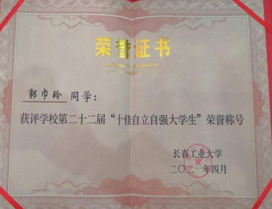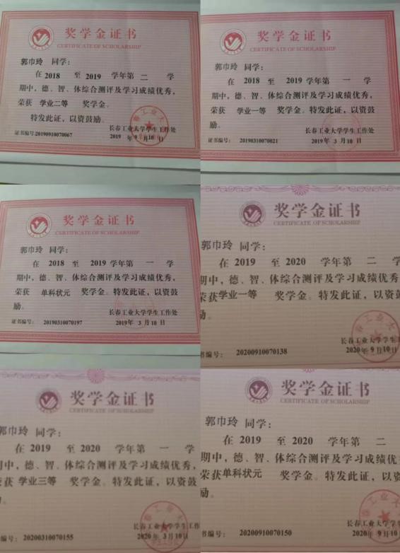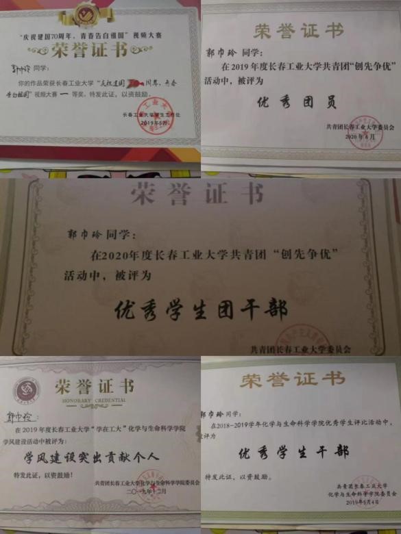 在校期间,曾获得2次国家励志奖学金,9次学业奖学金,3次单科状元;获得2020年度“长春市优秀共青团员”称号、快看漫画