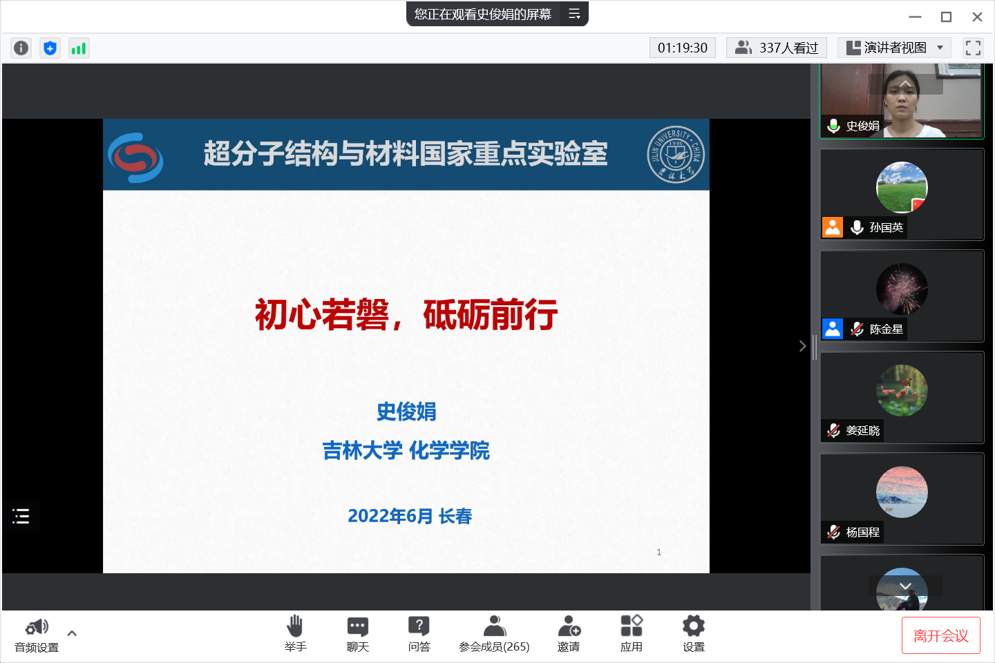 会上,姜延晓,王显,史俊娟,陈金星四位优秀毕业生分别以“向优秀之人看齐做更好自己”、“质子交换膜燃料电池:从催化剂到器件性能表达”、“初心如磐,砥砺前行”、“在长春的十年——从工大到应化所”为主题向同学们详细介绍了个人的学术研究方向,研究领域,个人就业经验以及课题组具体情况,讲述了自身考研复试的经历和经验,追忆在工大四年的宝贵时光,表达了对母校和老师的感谢和对老师同学的美好祝愿。并对同学们提出的有关考研和出国留学流程等问题进行了详细解答。最后,孙国英副院长进行总结,她鼓励同学们向优秀学生看齐,注重培养自身的科研兴趣和辩证思维能力,努力实现自我的人生价值。