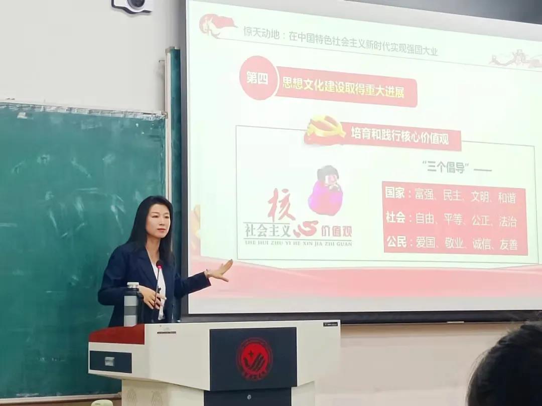 在此次报告中,张鸿冰老师主要以“铭党史,守初心,担使命”为题,从党史发展的四个时期讲述了中国共产党对中国带来的翻天覆地的变化。一是在新民主主义革命时期完成救国大业。中国共产党保持的良好精神状态转化为推进社会主义革命和建设的强大力量,从而带领中华民族站起来。二是在社会主义革命和建设时期完成兴国大业。新中国成立伊始,我国内忧外患,但我们国家伟大的领导人毅然选择了抗美援朝,保家卫国,而后又向苏联学习,进行社会改造。三是在改革开放和社会主义现代化建设新时期推进富国大业。改革开放四十年,中国大地发生了沧海桑田的变化,获得了举世瞩目的成就。四是在中国特色社会主义新时代推进实现强国大业,我国取得了经济建设、民主法治建设等十个方面的历史性成就。最后张鸿冰老师希望同学们可以坚定爱国信念,心系党和人民,忠于奉献。