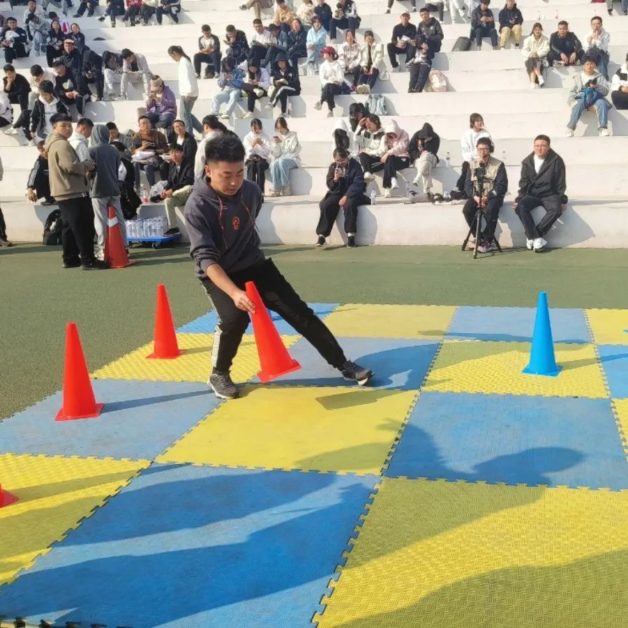赛道中依次分布跨栏、、跃龙门、独木桥、匍匐四个障碍,参赛队员背对起点出发,依次越过障碍物,到达中转线后返回起点,触碰下一名运动员背部后完成接力,8名队员完成比赛用时少者名次列前。跨栏项目要依次跨过每一个栏;跃龙门项目必须脚先进入;独木桥项目犯规从独木桥重新开始。