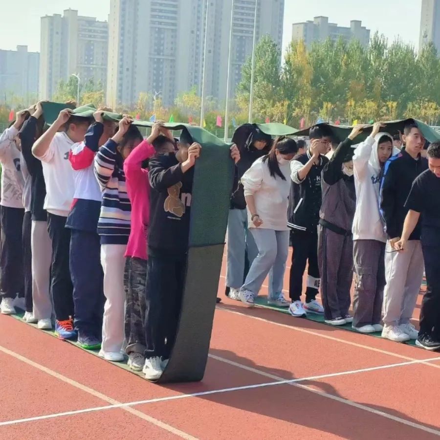 站在已经组装好的“履带”圈内,将所有队员以滚车轮的方式运行到终点,以“履带”最后部分通过终点计时停止。