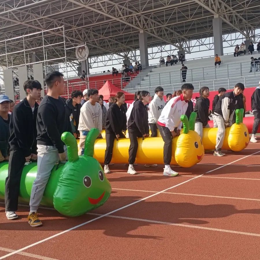 8人统一骑在毛毛虫上前行,双手徒手握住把手不得松开。毛毛虫不允许拖地跑,双脚不允许腾空,所有运动员和毛毛虫全部通过终点线后计时停止。