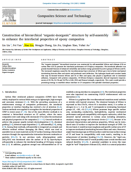 “天道酬勤”是沉淀在科技工作者基因血脉里的朴素信仰。在一个个平凡的日出日落间,一幕幕平常的实验场景中,大家都能看到刘浩同志的身影。作为一名理工类专业学生,她怀揣科技报国的理想追求。科研方面,在老师的指导下,该同志在本科期间就积极参与教师课题组科研项目,参与省级科创项目两项,以合著者身份在国际复合材料领域顶级期刊《Composites Science and Technology》(IF:9.1)上发表Construction of hierarchical “organic-inorganic” structure by self-assembly to enhance the interfacial properties of epoxy composites论文;在《Composites Part-B》(IF:13.1)上发表Water-based PEKC-COOH sizing agent for enhancing the interfacial adhesion of carbon fiber/polyether-ether-ketone composites论文。以项目负责人身份完成2021年度快看漫画