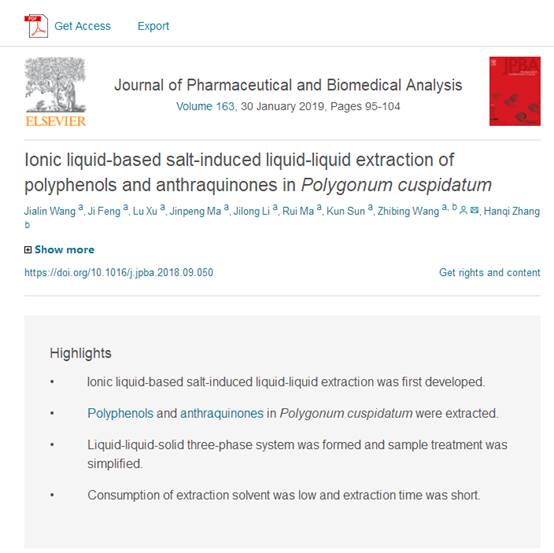 Journal of Pharmaceutical and Biomedical Analysis是药物分析领域重要的国际期刊之一,2017-2018年影响因子为2.831,属于医学大类3区,分析化学2区,药学2区。该研究基于高效、环保的理念,提出一种新的绿色、简单、微型化的样品前处理技术,即基于离子液体的盐诱导液-液-固萃取体系,用于中药材虎杖中多酚和蒽醌类化合物的分离分析,该法解决了以往研究方法中分离时间长以及消耗大量有机溶剂造成环境污染的问题。