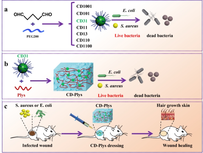 图5 a)CDs的制备及其对E. coli和S. aureus的抗菌活性的示意图;b)CD-Plys水凝胶的合成及其对E. coli和S. aureus的杀伤作用;c)CD-Plys水凝胶用作伤口敷料以防止细菌感染并促进伤口愈合。