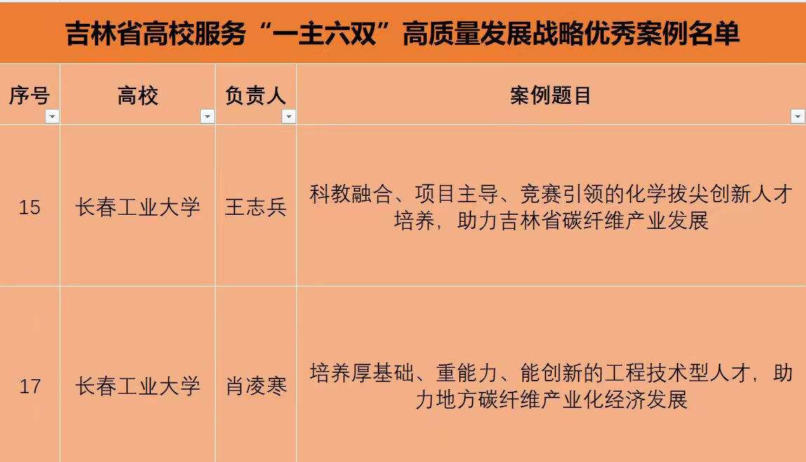 王志兵申报的“科教融合、项目主导、竞赛引领的化学拔尖创新人才培养,助力吉林省碳纤维产业发展”,肖凌寒申报的“培养厚基础、重能力、能创新的工程技术型人才,助力地方碳纤维产业化经济发展”2 项案例成功入选。