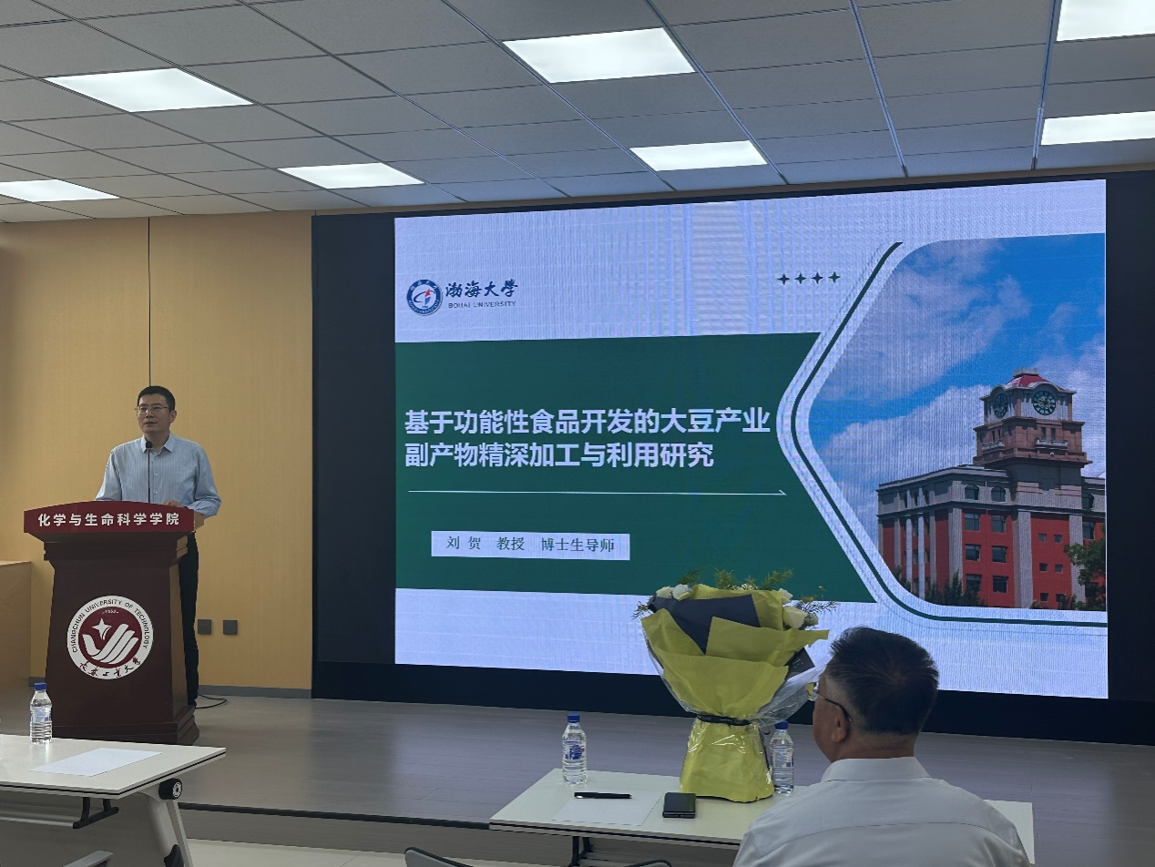 座谈会后,刘贺校友作了题为《基于功能性食品开发的大豆产业副产物精深加工与利用研究》的学术报告,系统介绍了其团队在豆清、豆渣、豆皮等副产物高值化利用方面的创新技术与应用前景,并与现场师生进行了热烈的交流与互动。