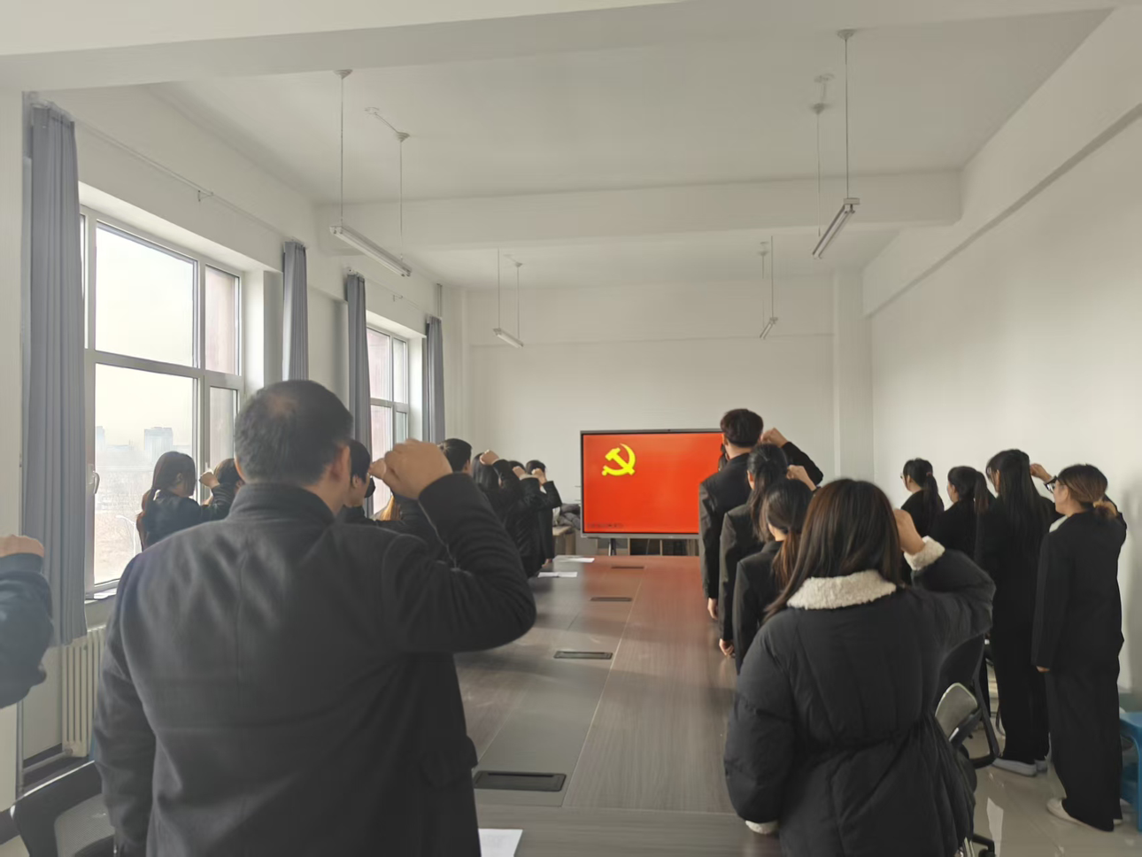 于化学化工楼A307会议室举行2025年新发展党员入党宣誓仪式。学院党委副书记郑岩、党员代表及21名新发展党员参加了此次仪式。