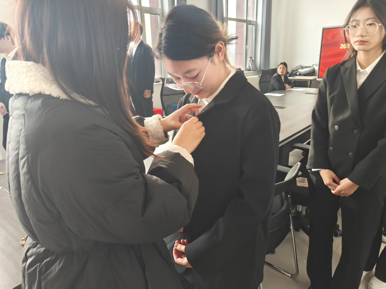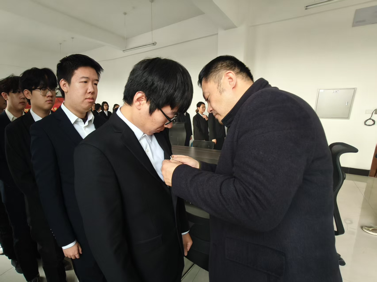 随后,佩戴党员徽章环节如期举行。党员代表郑岩书记与刘扬老师为新发展党员郑重佩戴党员徽章。熠熠生辉的党员徽章不仅是党员身份的象征,更承载着党的使命与荣光,提醒着新党员们时刻以党员标准严格要求自己,在各项工作中亮身份、树形象、作表率。