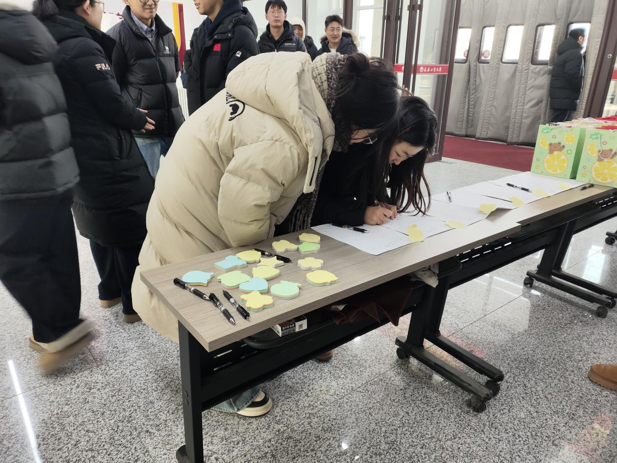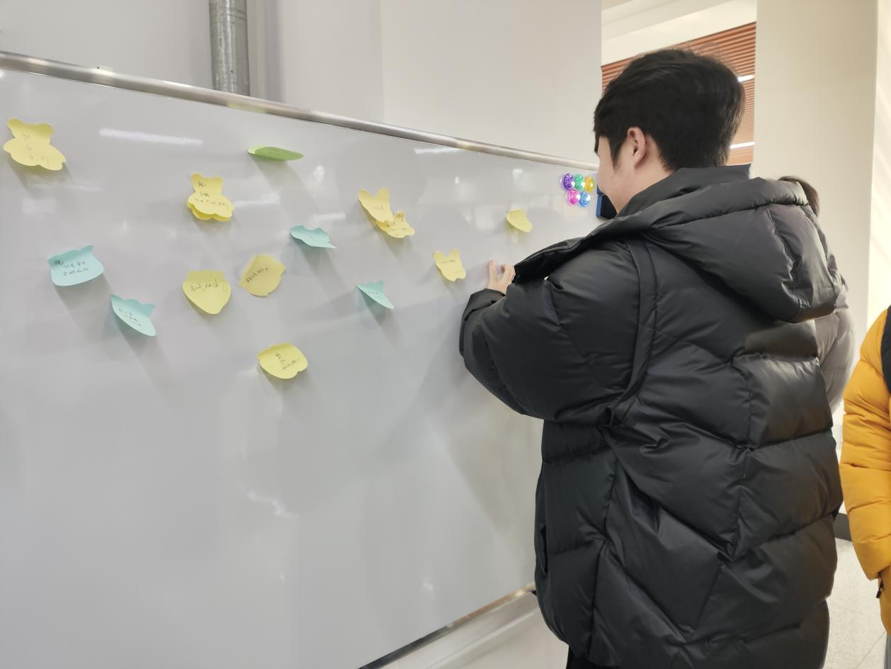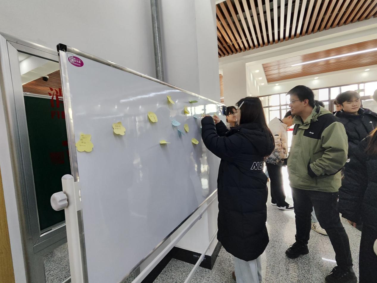活动现场特别设置“心愿贴纸墙”互动环节。同学们纷纷拿起写满心声的小贴纸,在白板上郑重粘贴,写下自己心中的目标院校与奋斗誓言:“稳住,我能赢!”“一战成硕!”“上岸985!”“不负青春,不留遗憾!”“致那个每天早起背书的自己!”……大家认真写下自己的考研目标,将梦想贴上墙一张张贴纸,如点点星光汇聚成河,它们不只是文字,更是青春的呐喊与执着的回响。在这里,每一个梦想都被看见,每一滴汗水都被铭记。
