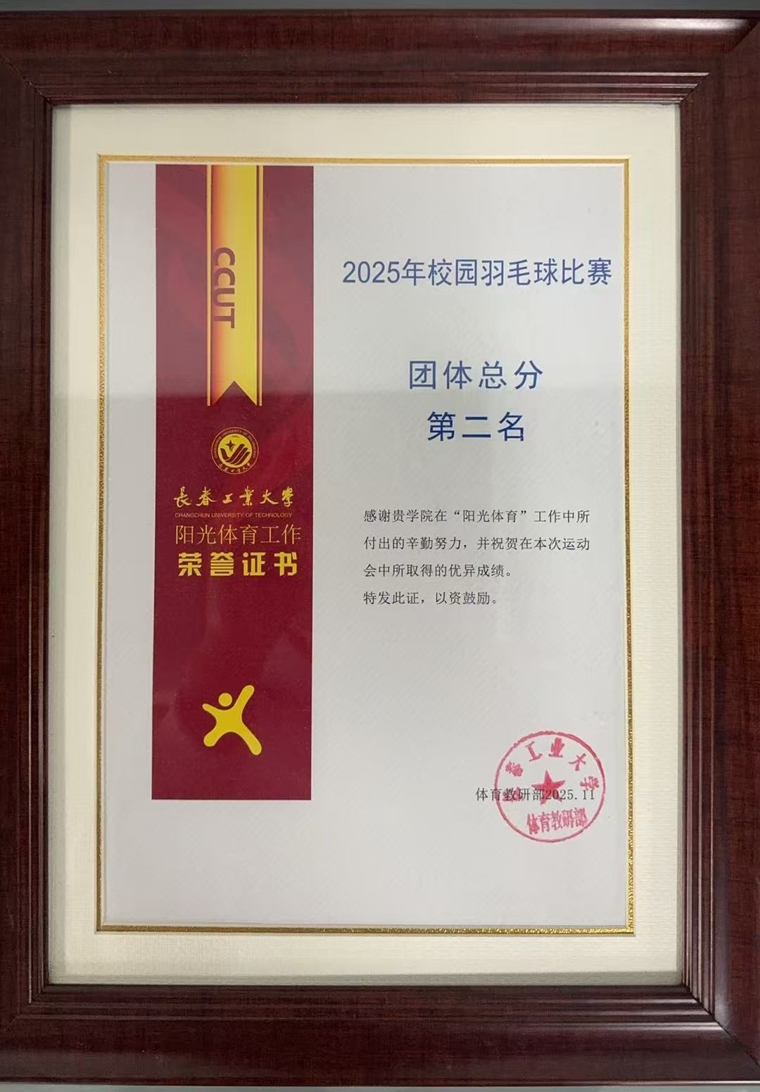 在2025年学校组织的羽毛球比赛中斩获全校团体总分第二名、混双冠军,女双冠军的优异成绩。