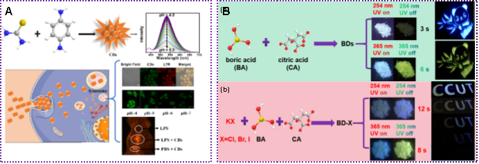 图2. (A)具有溶酶体靶向功能的碳点基荧光探针用于监测体内、外的pH变化