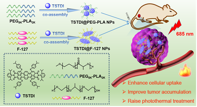 图3. 球形(TSTDI@PEG-PLA)和纺锤形(TSTDI@F127)纳米粒的制备及在光热治疗中的应用