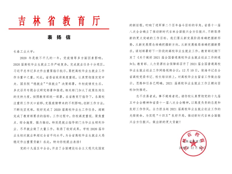 认真贯彻国务院、中央军委征兵命令和省征兵工作领导小组会议精神,在省委、省政府的正确领导下,在省军区、省教育厅具体指导下,主动克服疫情带来的不利影响,将工作关口前移,创新工作方法,不断攻坚克难,超额完成了 2020 年大学生征兵工作任务。工作过程中,学校高度重视,领导靠前指挥、亲自调度,征兵工作部门加大动员力度,强化服务保障,做了大量卓有成效的工作,超额完成了年度大学生征集任务,为全省高校大学生征兵工作作出重要贡献!在此,特向你校提出表扬!